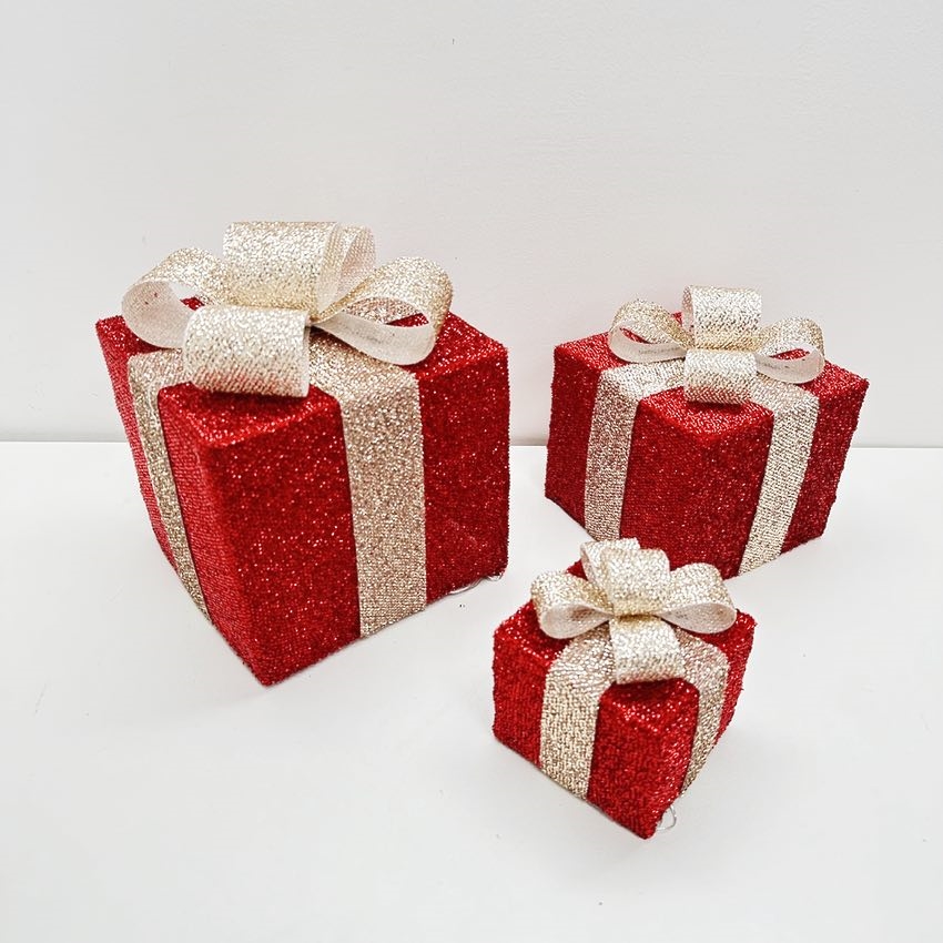 Gaveæsker i rød glitterstof med LED-lys – sæt med 3 stk.