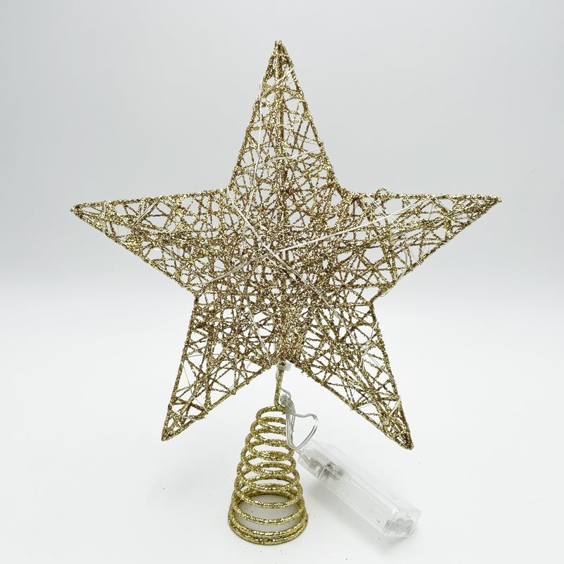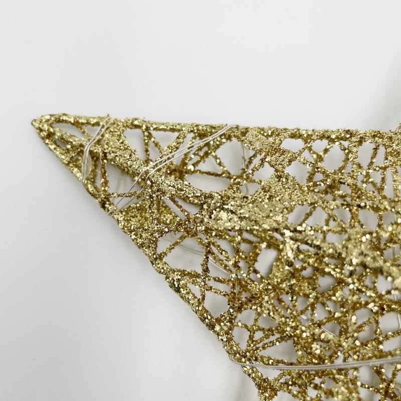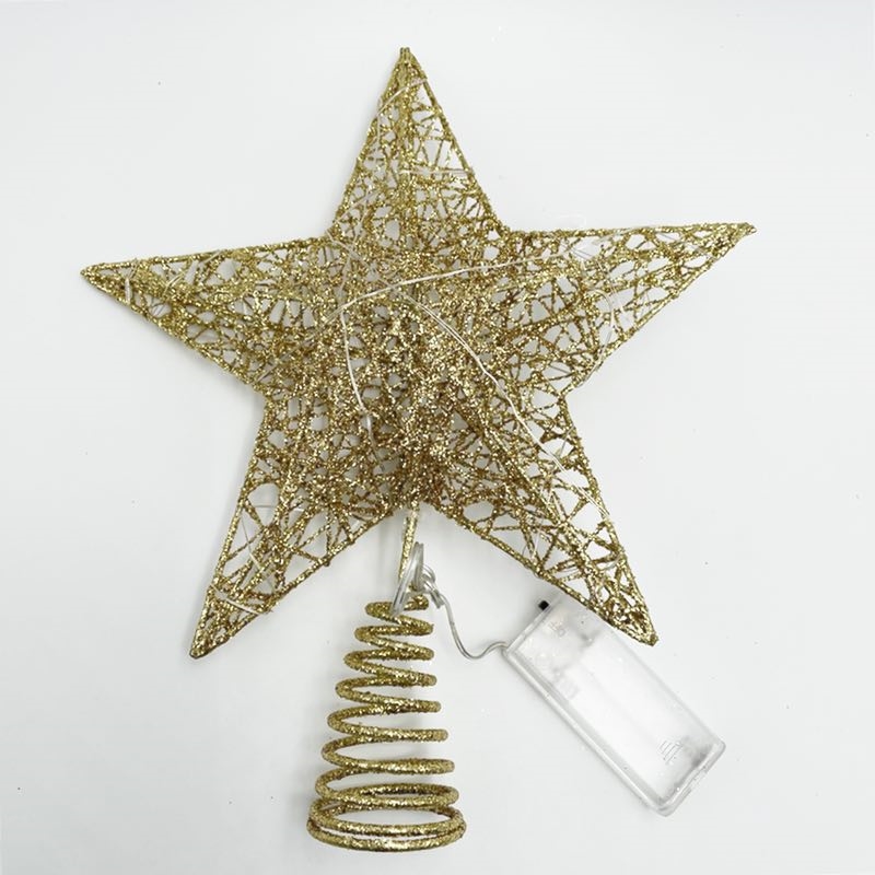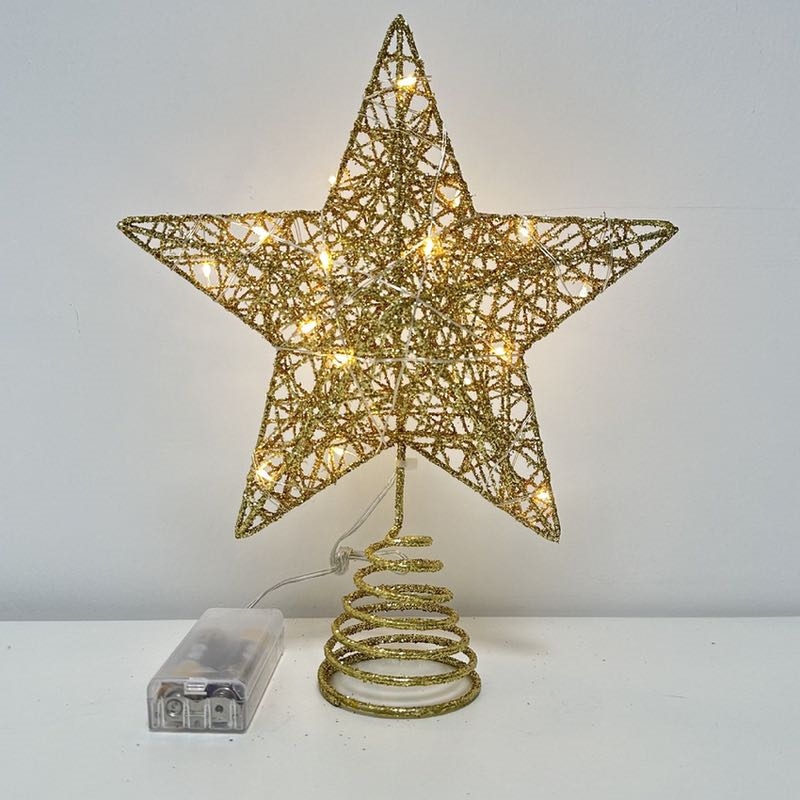 Denne smukke guld topstjerne med glimmer og indbygget LED-lyskæde giver juletræet et elegant og festligt udtryk.