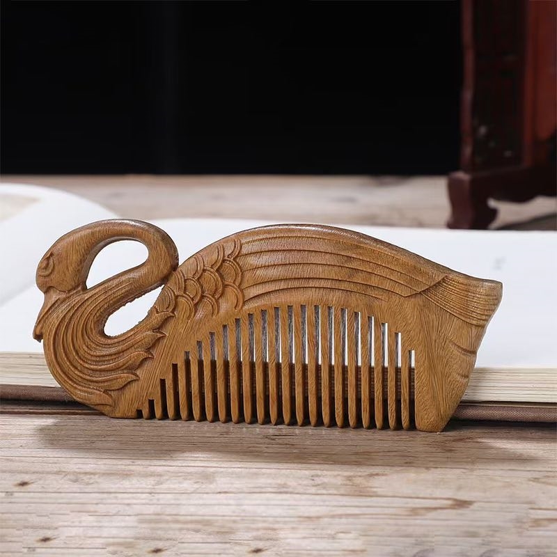 Håndlavet trækam i svaneform er fremstillet i massivt naturtræ, den er enkel og elegant. Kammen ligger godt i hånden og har glatte, afrundede tænder, som er skånsomme mod hår og hovedbund.