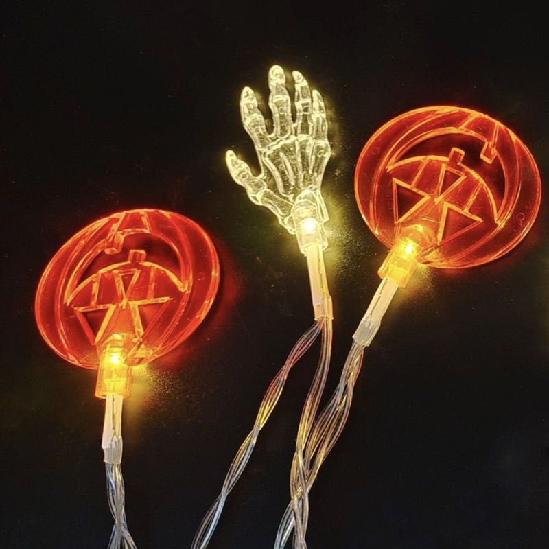 Giv dit Halloween-fest den perfekte gyserstemning med vores Halloween lyskæde med kraniehænder og græskar. Denne unikke lyskæde er designet til at skabe en skræmmende og festlig atmosfære på din Halloween-fest, skræmmeevent eller temafest.