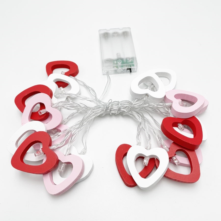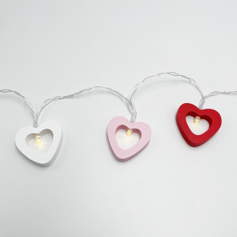 Lyskæden består af hjerter i tre harmoniske farver – rød, hvid og lyserød – og giver et blødt og varmt LED-lys.