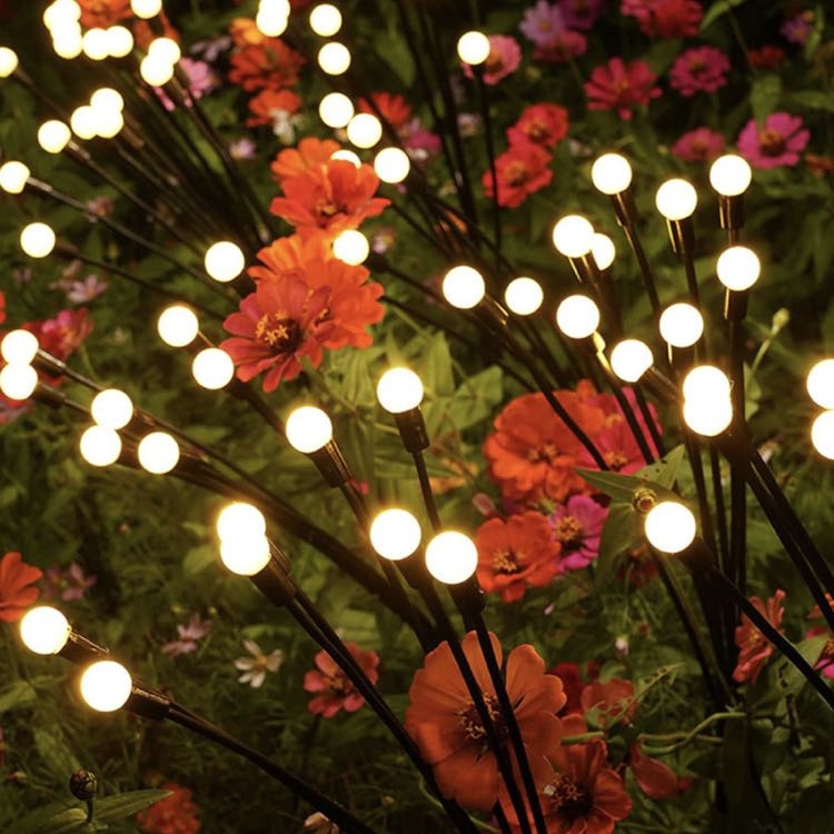 Lampen består af seks små pærer, som kan udsende varmt hvidt lys eller multifarvet lys. Stængerne, der understøtter pærerne, er fjedrende, så lyset bevæger sig med vinden og skaber en effekt, der minder om ildfluer om sommeren, hvilket skaber en hyggelig og afslappende atmosfære i din have.