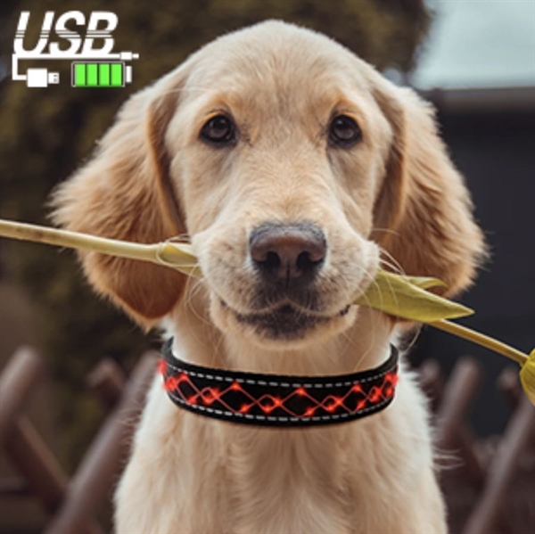 LED broderi reb hundehalsbånd kombineres med højdepunktsreflekterende silkebånd med fin syning. Det lysende mønster gør det til moderigtigt og unikt lysende kunst. Den giver en høj synlighed og en stor sikkerhed når du går tur med din hund.