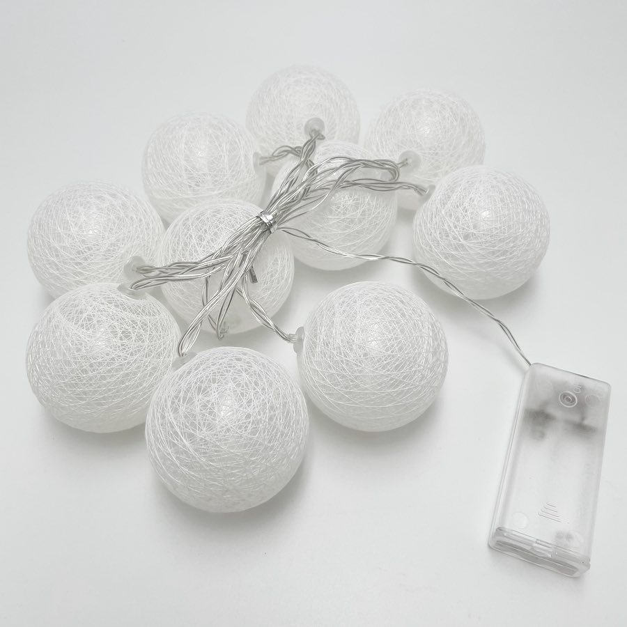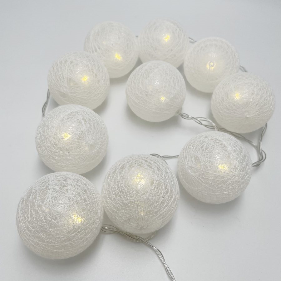 LED lyskæde med bomuldsbolde i hvide farver - 1,5 meter, 10 bolde - Ø 6 cm
