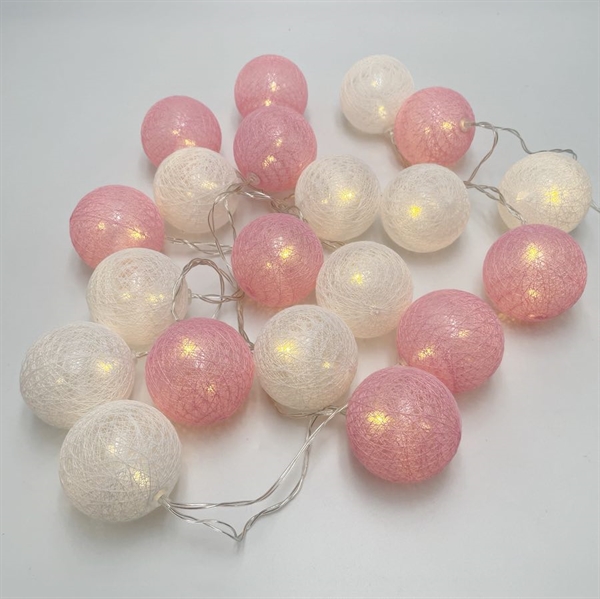 LED lyskæde med bomuldskugler i lyserød og hvid - 3 m