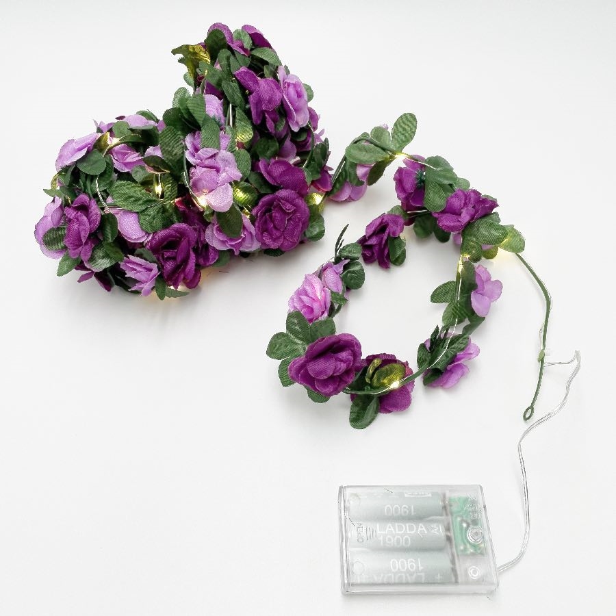 Lyskæden er dekoreret med en kombination af mørke og lyse lilla blomster samt grønne blade, hvilket skaber en fortryllende visuel kontrast.