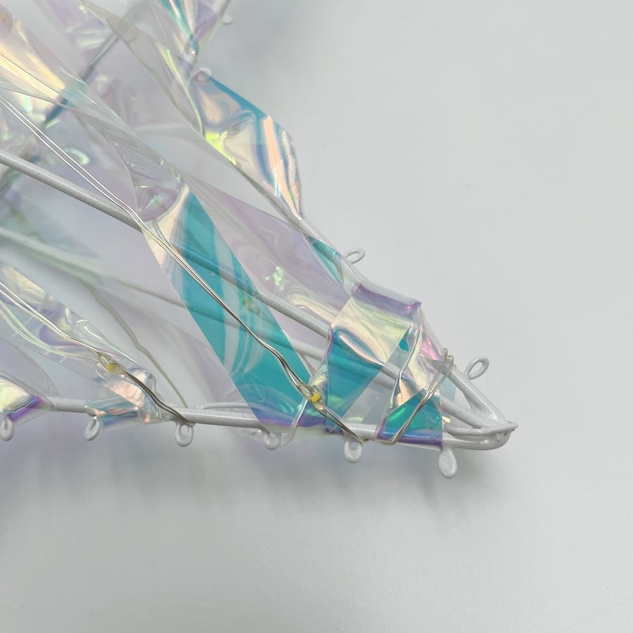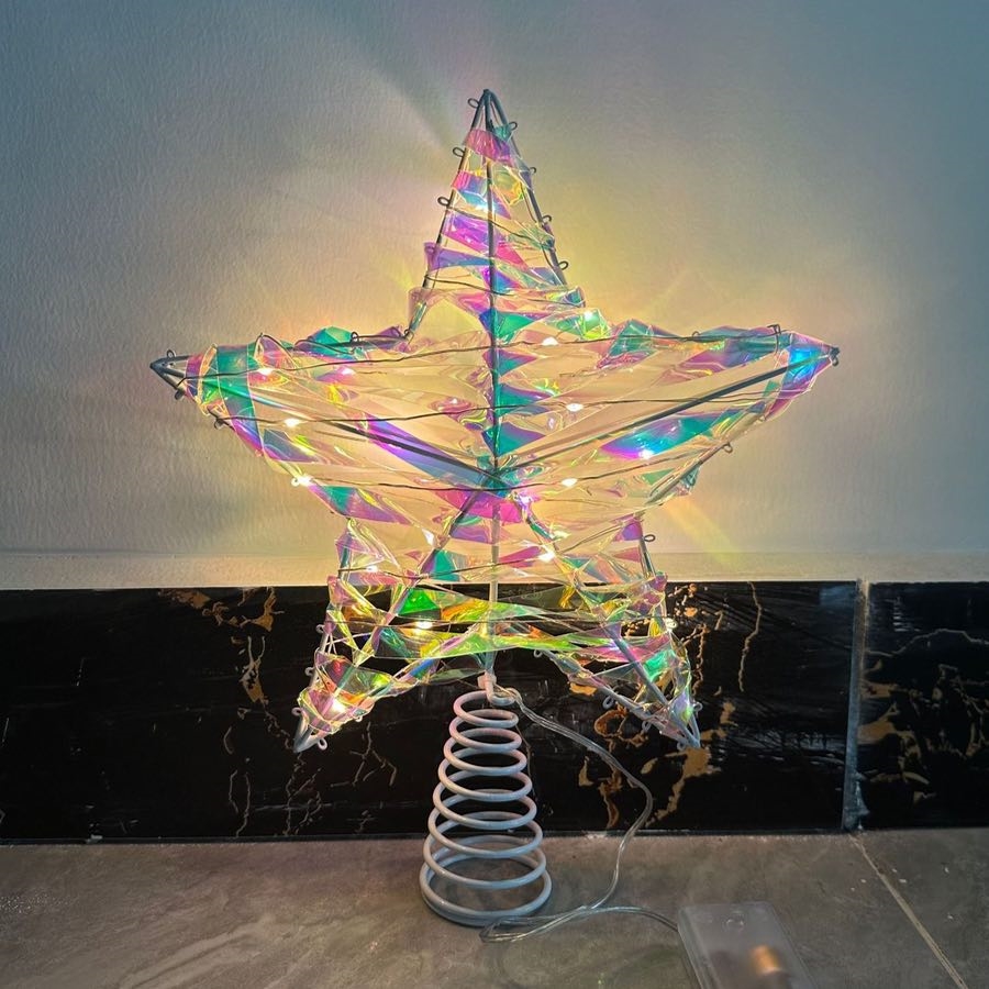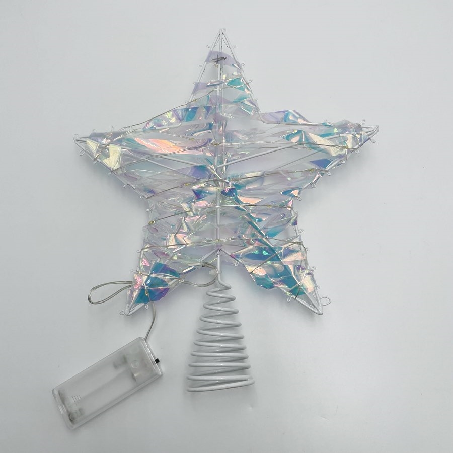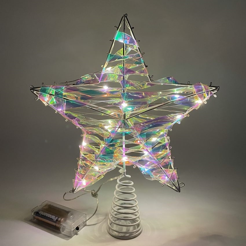 Denne LED topstjerne til juletræet har et flot femtakket stjernedesign med en regnbuefarvet folie, som giver farverige lysreflektioner, når lyset tændes.
