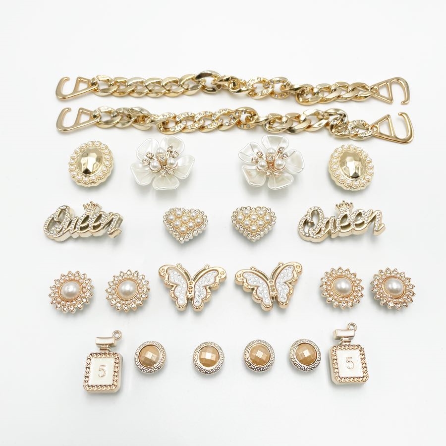 Dette luksuriøse charms-sæt til Crocs kombinerer guldlook, perler og rhinsten for et elegant, feminint og stilfuldt udtryk. Sættet indeholder flere forskellige designs, herunder blomster, sommerfugle, hjerter, “Queen”-emblemer samt mini parfume-flakon charms. Derudover medfølger dekorative kæder, som kan monteres over forfoden for et ekstra glamourøst look.