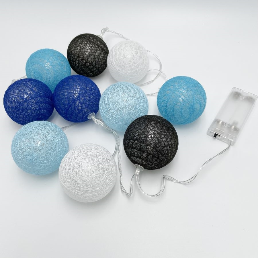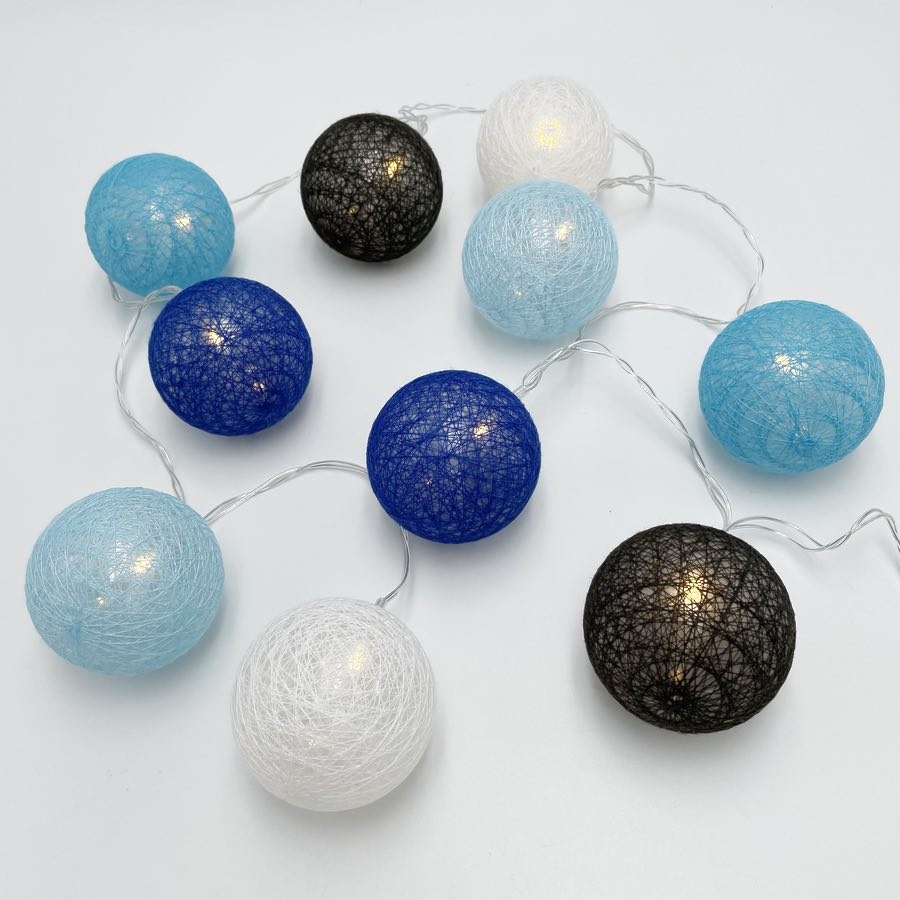 LED lyskæde med bomuldskugler i blå, sort og hvid - 1,5 m 10 LEDs