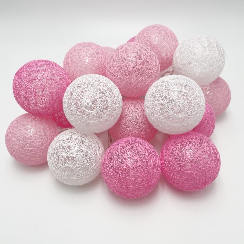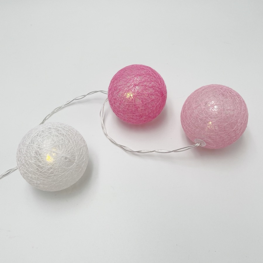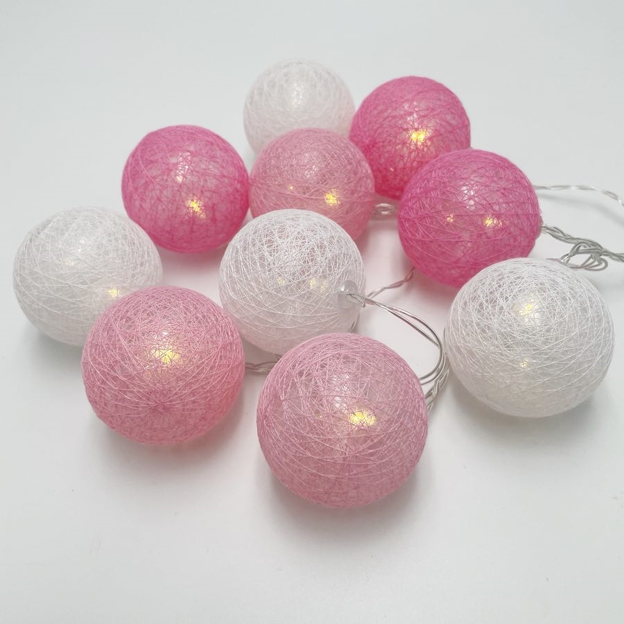 LED lyskæde med lyserøde og hvide bomuldskugler – 2 m / 3 m – Ø 6 cm