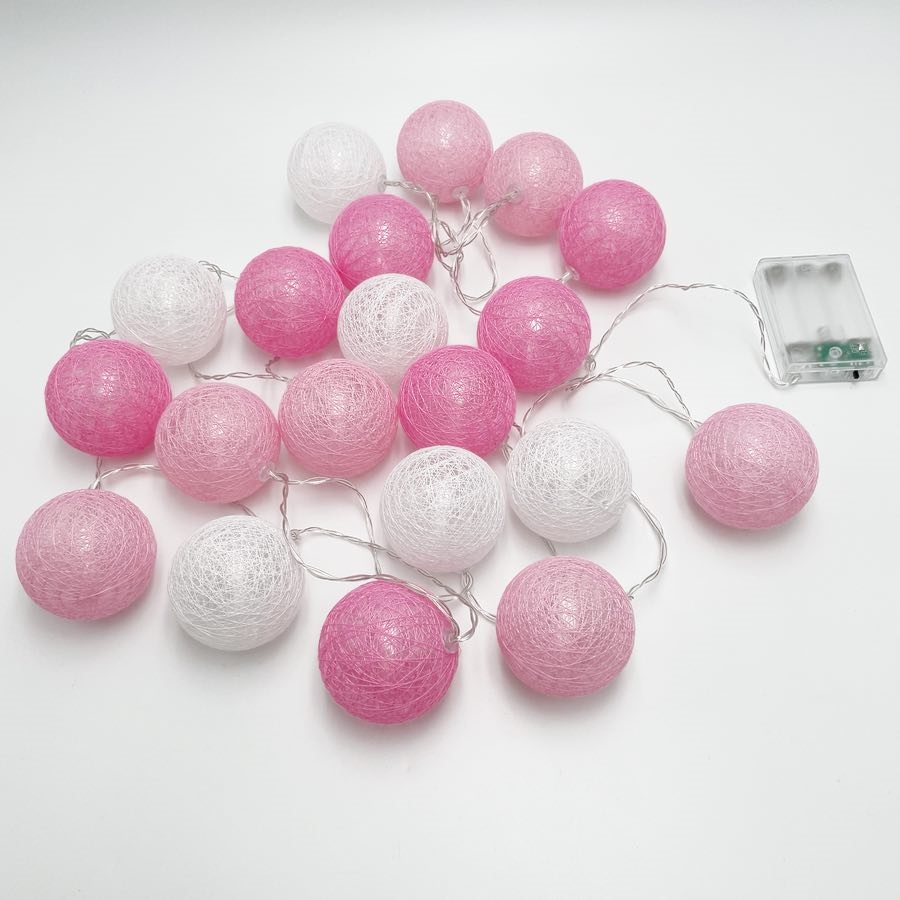 LED lyskæde med lyserøde og hvide bomuldskugler – 3 m 20 lys – Ø 6 cm