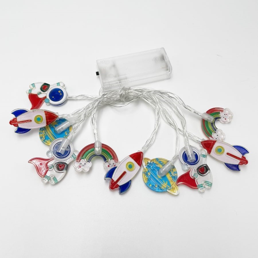 LED lyskæde med raketter, astronauter, planeter og regnbuer