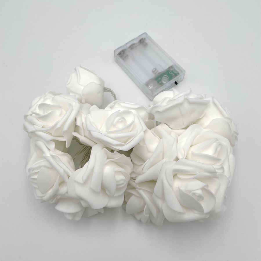 LED lyskæde med hvide roser - 3 m 20 lys - Rosediameter 7 cm