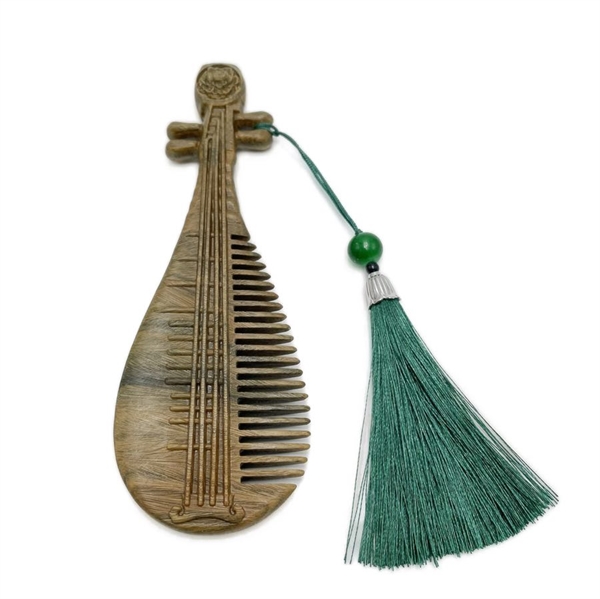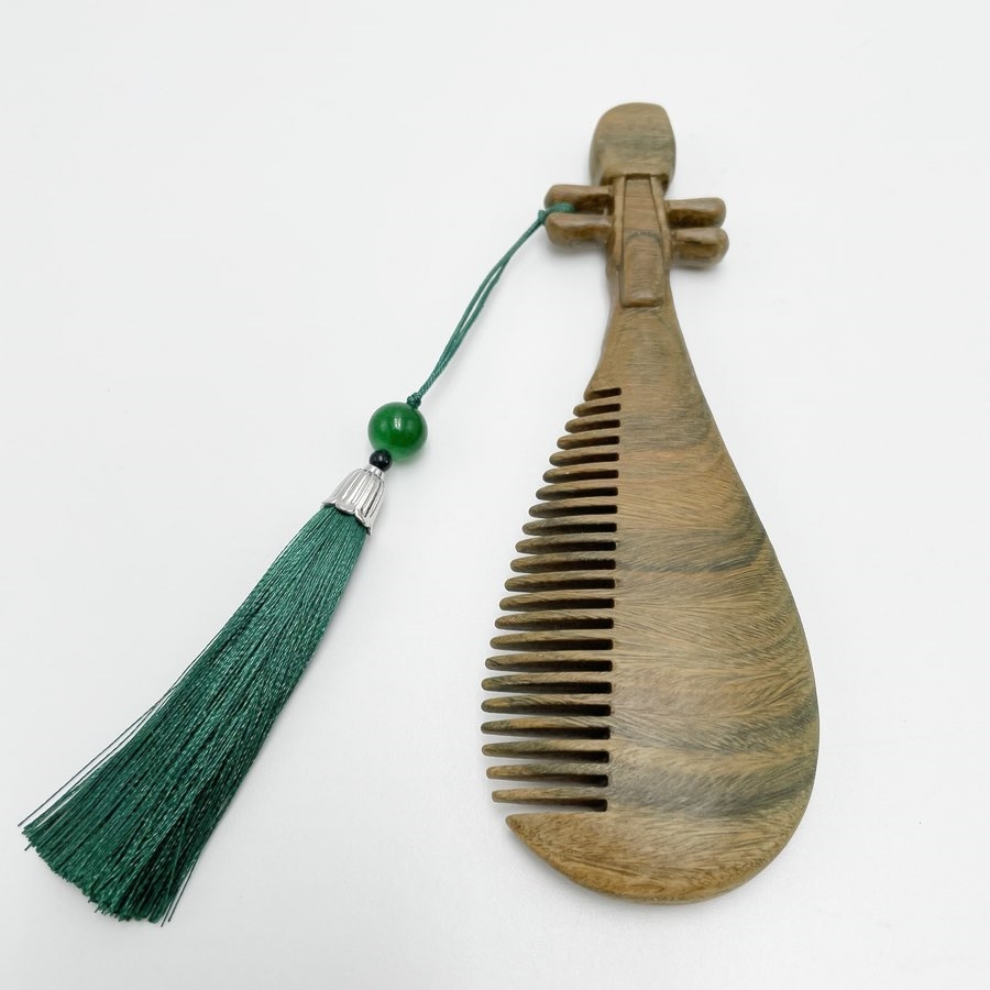 Orientalsk trækam med et elegant, klassisk udtryk. Formen er inspireret af det traditionelle kinesiske instrument “pipa”, og den grønne kvast giver kammen et dekorativt og raffineret look.