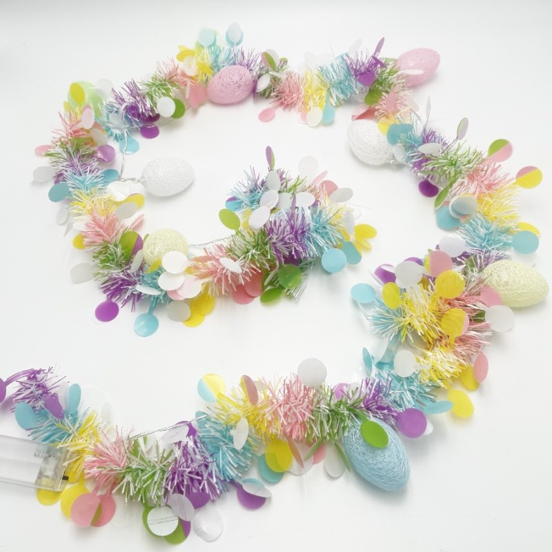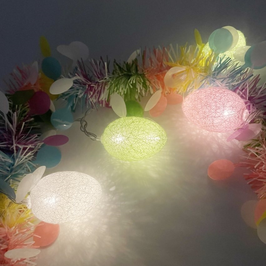 Æggene er omviklet med bomuldstråd, der giver et elegant og dekorativt udtryk med en blød lyseffekt. Lyskæden er dekoreret med farverige pyntetråde og små dekorative skiver, der giver et livligt og festligt look.