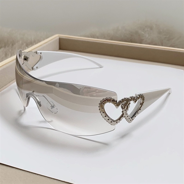 Giv dit outfit et romantisk og stilfuldt twist med disse unikke solbriller med hjertepynt. Den buede, kantløse linse skaber et moderne og elegant look, mens de dekorative dobbelte hjerter i guld eller sølv tilføjer et feminint og charmerende udtryk. Perfekt til både hverdag og særlige lejligheder – uanset om du er på festival, ferie eller blot ønsker at skille dig ud i byen.