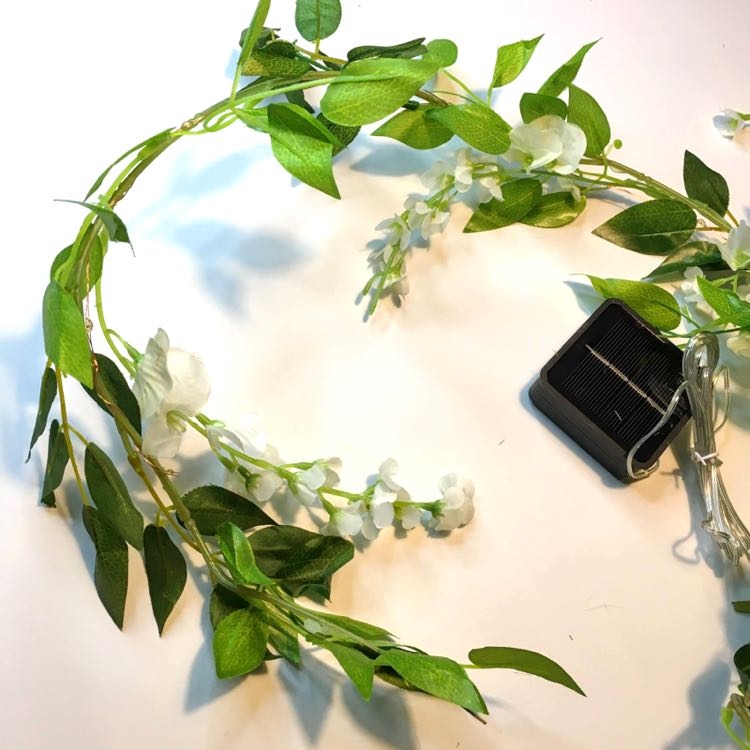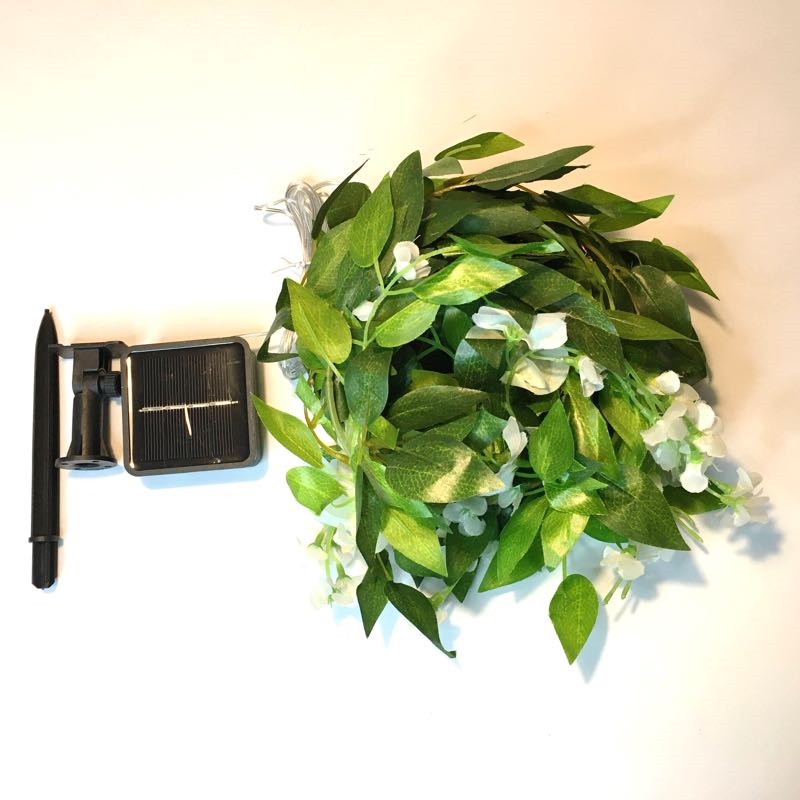 Solcelle lyskæde med hvide blomster og grønne blade er perfekt til dekoration i haven.