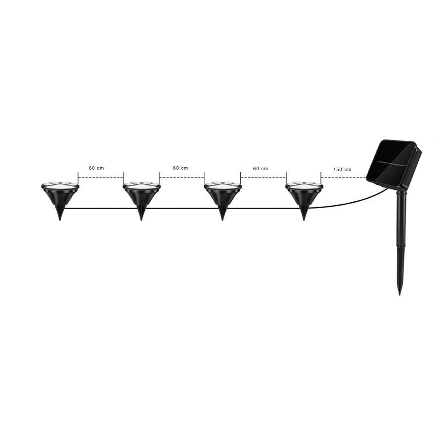 Denne solcellelampe består af 4 poteaftryk og der er ledninger mellem hver potelampe.